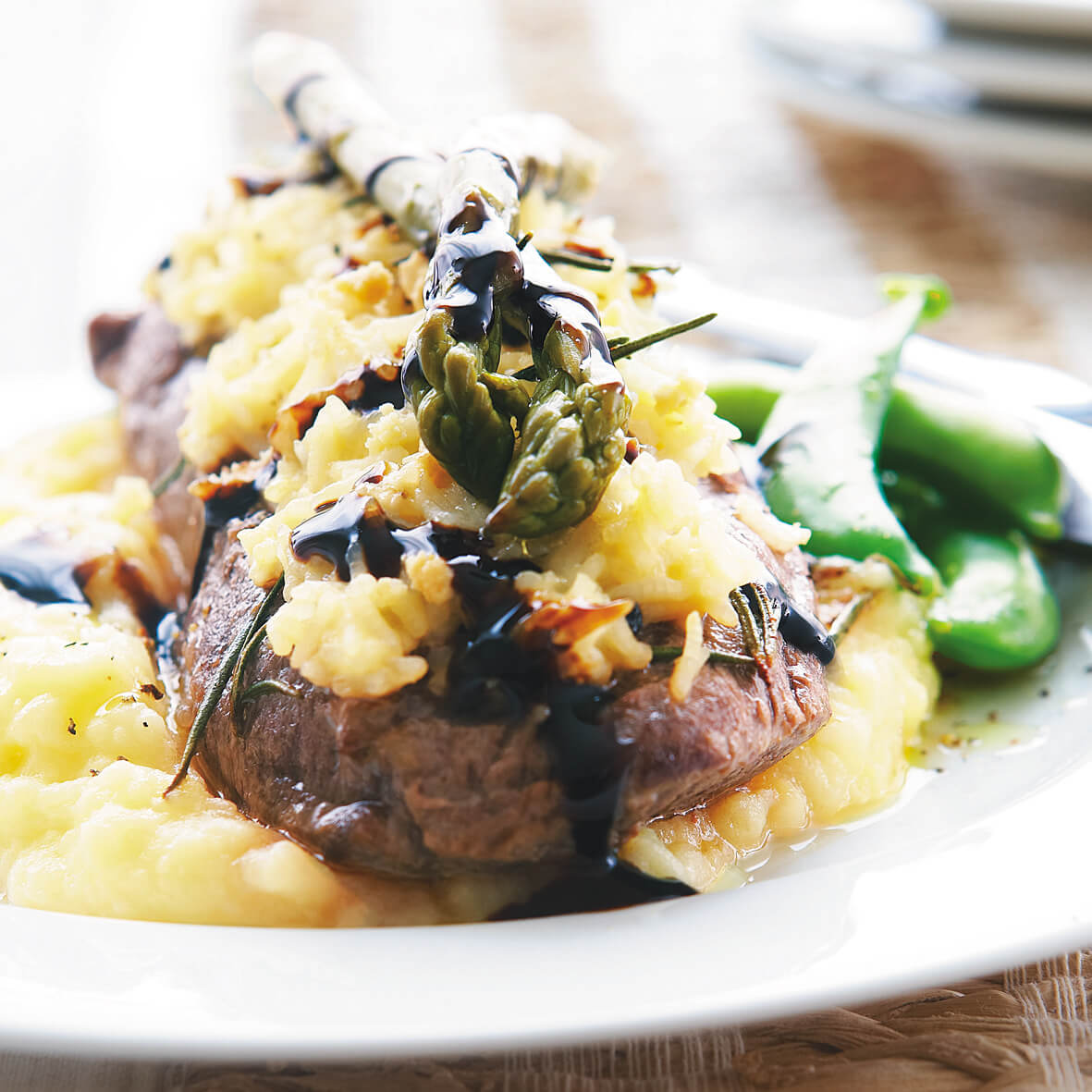 Place asparagus spears on each lamb portion, cracked pepper and balsamic glaze and serve with creamy mashed potatoes and steamed sugar snap peas.