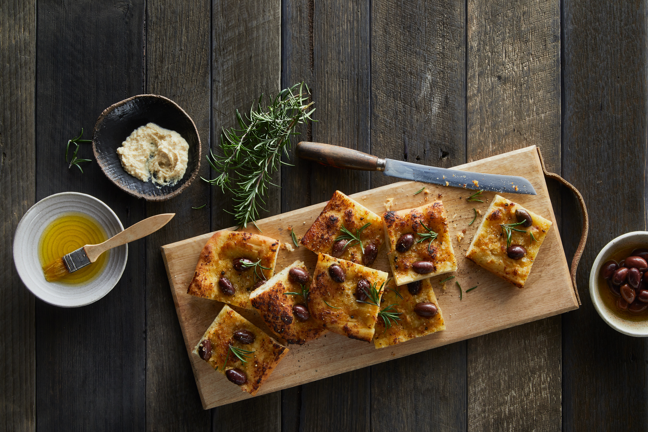 Combine En Placé Garlic with the remaining oil and spread over the dough, dimpling it again. Top with olives and rosemary sprigs and sprinkle with rock salt and pepper.