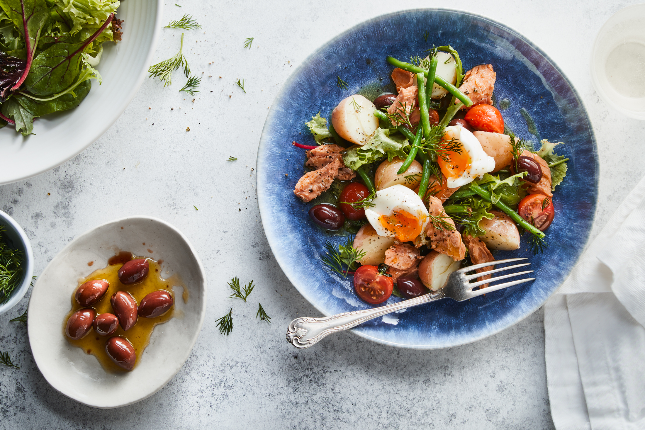 Arrange layers of 50g salad leaves, 200g potatoes, 50g beans, 50g tomatoes, 100g Ocean Supreme Salmon pieces and 20g Riviana Olives onto each serving plate. Drizzle with 60ml dill dressing. Top with a broken open egg and garnish with extra dill and pepper.